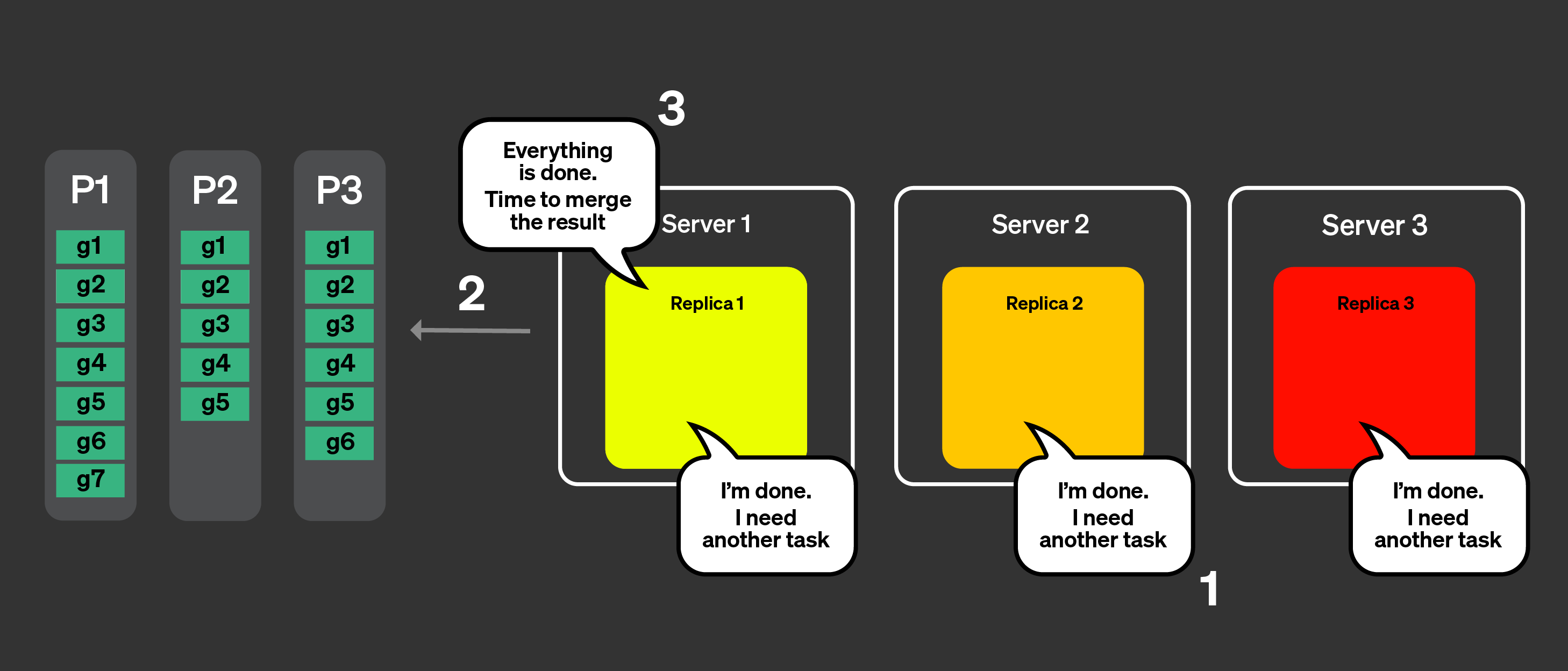 Чтобы решить проблему задержки, мы добавили динамическое координирование. Это означает, что все гранулы не отправляются реплике в одном запросе, но каждая реплика сможет запрашивать новую задачу (набор гранул для обработки) у координатора. Координатор даст реплике набор гранул на основе полученного объявления.
