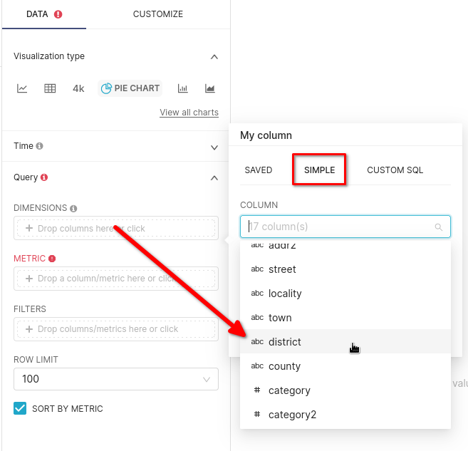 - Чтобы создать новую диаграмму, выберите Charts в верхнем меню и нажмите кнопку для добавления новой диаграммы. Вам будет представлено много вариантов. В следующем примере показана Круговая диаграмма с использованием набора данных uk_price_paid из выпадающего меню CHOOSE A DATASET: