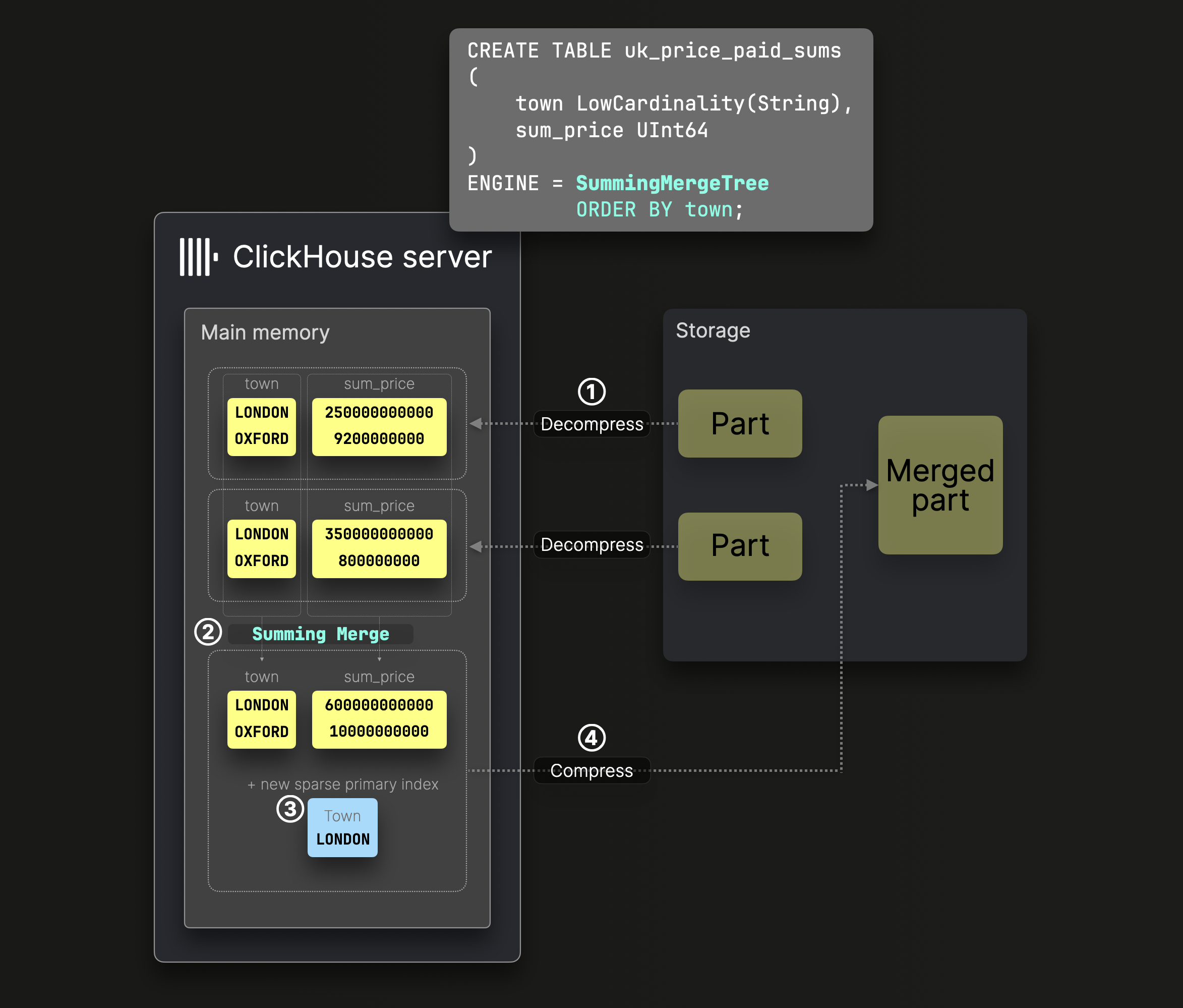 На этапе ② слияния ClickHouse заменяет все строки с одинаковым ключом сортировки одной строкой, суммируя значения числовых колонок.